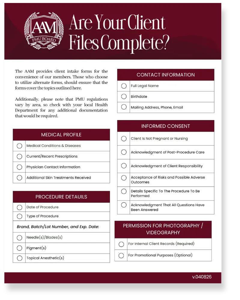 This checklist outlines the required information your intake forms should include before performing any procedure.